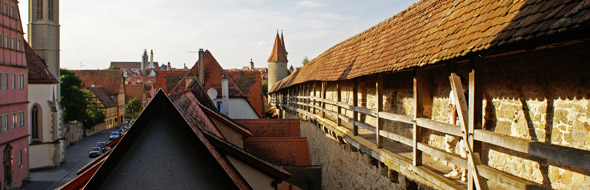 Rares sont les villes en Europe à posséder des remparts, des tours et portes aussi bien conservés et praticables. Au cours du développement de la ville et de son ascension économique entre le XIIe et le début du XVIe siècle, à plusieurs reprises le mur d'enceinte fut repoussé plus loin et toujours mieux fortifié avec de nouvelles tours et portes. On peut aisément distinguer ces différentes extensions sur le plan de la ville. La chance de Rothenburg fut qu'elle ne se développa plus dès le XVIe siècle en raison de son déclin rapide. A l'exception du mur donnant sur la partie de la ville protégée par la vallée de la Tauber, vous pouvez emprunter le chemin de ronde sur plusieurs kilomètres, à savoir de la porte "Spitalbastei" jusqu'à l'Eglise Saint Wolfgang. Pour éviter une trop longue marche, nous vous suggérons de descendre du rempart à la magnifique porte "Rödertor" pour descendre la Rödergasse en direction de l'Hôtel de ville afin d'apprécier une autre célèbre vue de Rothenburg, la porte du 1 er rempart, la Rödertor avec la Markusturm. A proximité de la Rödertor (direction Spitalbastei), vous apercevrez l'ancienne forge en colombage triangulaire Gerlach.